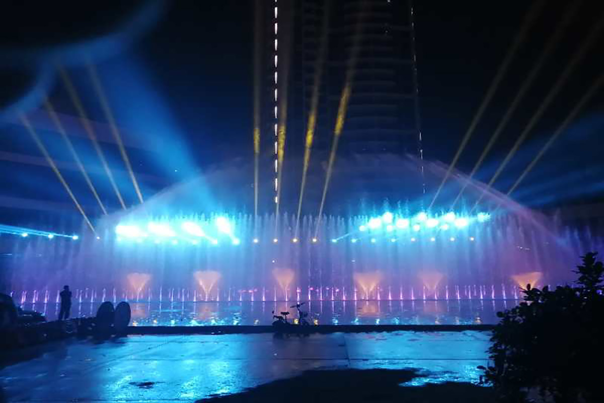 水舞蜿蜒水秀勾出壮丽曲线,水秀设计师以龙腾为灵感,将其转化为抽象的、行云流水的喷泉曲线,造就全长约50米,宽约12米,总面积约600平方米的壮丽喷泉,中心主喷最高约30米。一千多只喷头,跑泉、百变、彩虹、水幕、一维、圆摇、波光跳泉、数码水帘、呐喊喷泉等多种形态各异的水型,一千多盏DMX512LED水下灯……在智控编程下,上演优雅的水中芭蕾,光影迷离、梦幻朦胧,龙城夜秀唯美动人。